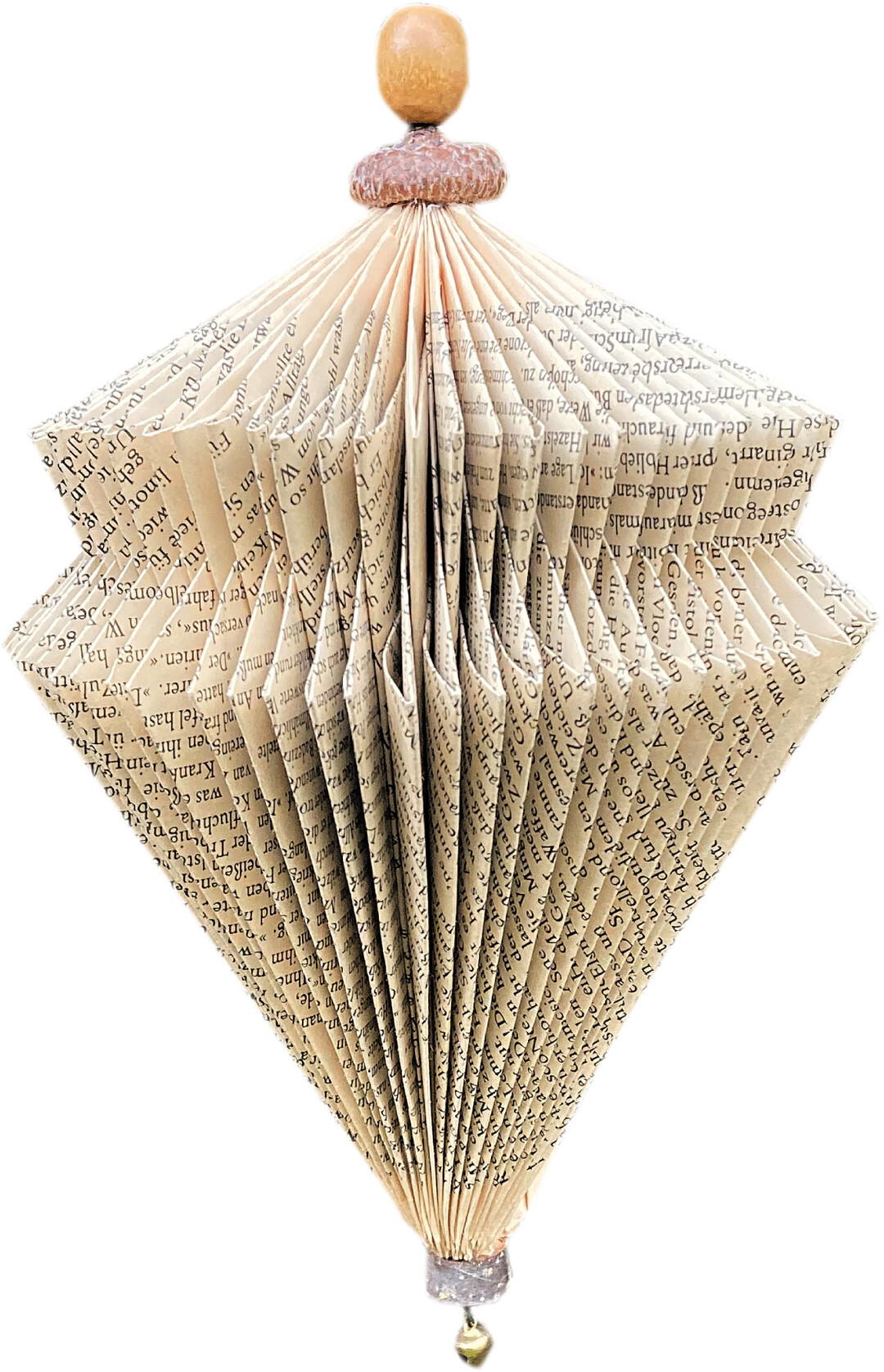 Papierdiamanten sind eine echte Alternative zur Weihnachtskugel. Im Fenster dekoriert sind sie ein echter Hingucker. Tipp: Einer ist keiner. In einer Gruppe aufgehängt erzielen sie nochmal eine bessere Wirkung. Benötigt werden hierfür ein altes Buch, Wickeldraht und Cuttermesser sowie eine Heißklebepistole. Bei einem gebundenen Buch entfernt man zuerst den Buchrücken sowie den Einband. Bei einem Taschenbuch schneidet man mit dem Cutter einfach die erste und letzte Seite, also auch den Einband, ab. Achten Sie darauf, dass alle Seiten fest zusammenhalten. Sollten sich am Anfang Seiten lösen, dann entfernen Sie diese einfach. Das ist wichtig, damit zum Schluss alles gut zusammenhält. Dann faltet man die obere rechte Ecke nach links zur Mitte...