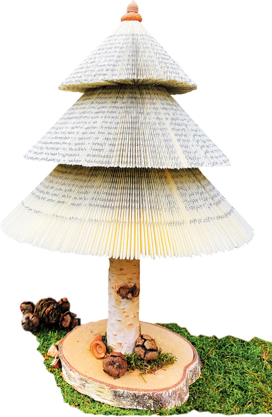 Für dieses hübsche Tannenbäumchen ist nicht viel Material, aber dafür jede Menge Geduld nötig. Hat man aber erst einmal angefangen, packt einen aber bald das „Buch- und Bastelfieber” ... Benötigt werden: Ein Buch mit circa 400 Seiten, ein Cuttermesser, ein Lineal, ein Aststück und eine Baumscheibe sowie Heißkleber. Hinzu kommt noch Dekomaterial nach Wahl. Zuerst nimmt man eine Seite aus dem Buch heraus, um eine Schablone zu erstellen. Die Seitenlänge teilt man durch drei und markiert dies auf einem Blatt. Bei einer Buchlänge von 18 cm markiert man auf der linken oberen Seite ein Quadrat mit einer Seitenlänge von jeweils 6 cm. Das Gleiche auf der rechten unteren Seite. Genau in der Mitte, also 3 cm vom oberen und unteren Quadrat entfernt,...