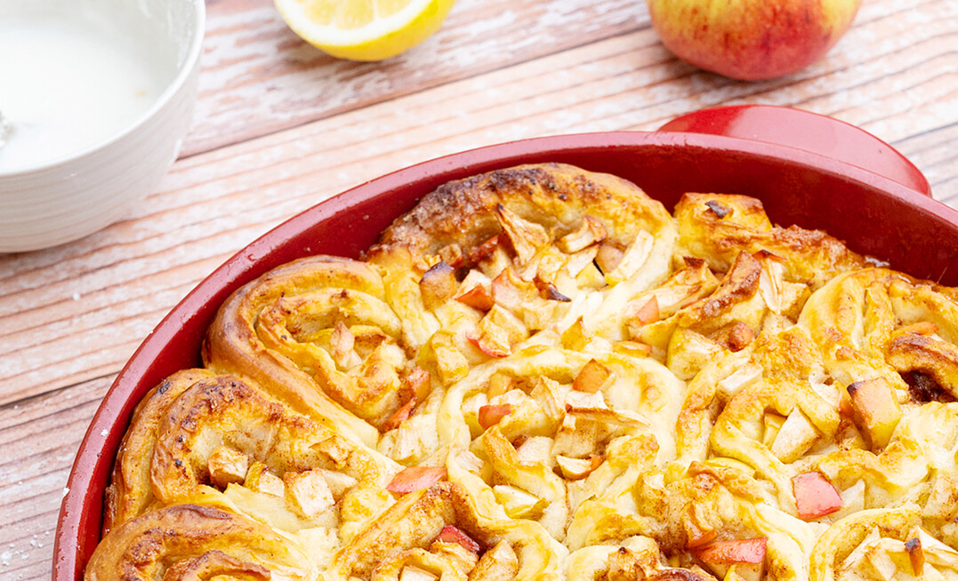 - Puderzucker mit Zitronensaft verrühren und den Guss über den Apfel-Zimtschnecken verteilen.