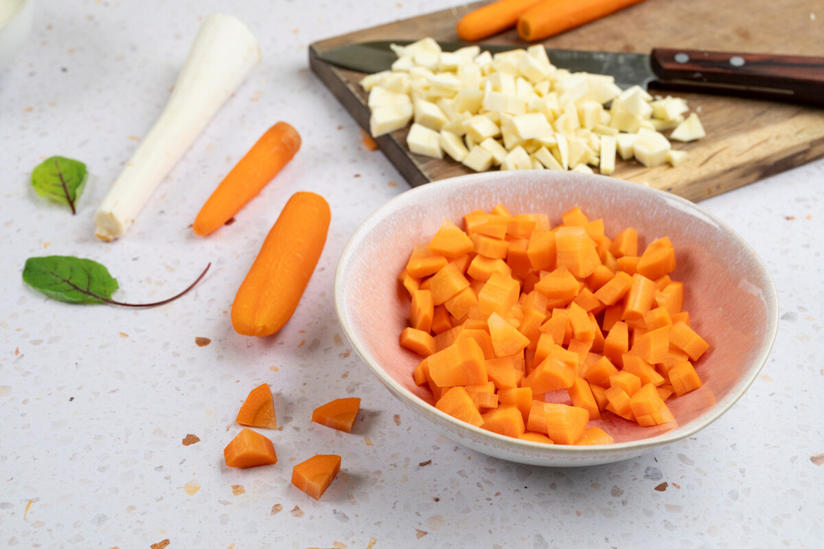 - Wurzelgemüse schälen, Strunk entfernen und klein würfeln. Schalotten schälen und fein hacken. Öl in einer Pfanne erhitzen, Schalotten darin anschwitzen und dann das Gemüse dazugeben. Mit 1 TL Curry, Salz und Pfeffer abschmecken und etwa zehn Minuten bissfest dünsten.