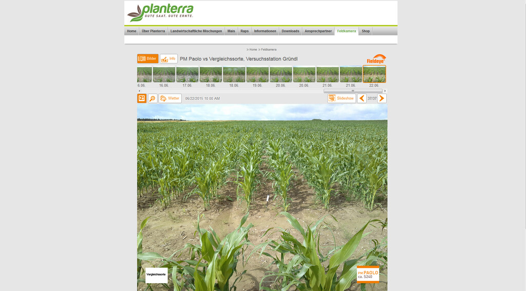 Seit Anfang Juni ist der Sortenversuch für Planterra Saatmais online per Feldkamera zugänglich. Auf www.planterra-saaten.de/feldkamera wird die Entwicklung des Maisbestandes mit einer benachbarten Vergleichssorte transparent dokumentiert.