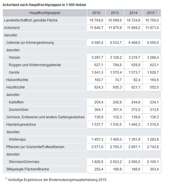 Die Anbaufläche von Weizen ist gegenüber dem Jahr 2014 von 3,2 Millionen Hektar auf 3,3 Millionen Hektar angestiegen (+ 2 Prozent). Im Jahr 2015 entspricht das 28 Prozent der gesamten Ackerfläche. Dabei blieb der Winterweizen mit 3,2 Millionen Hektar die wichtigste Getreideart und bedeutendste Feldfrucht insgesamt. Die Anbaufläche von Roggen und Wintermenggetreide sank gegenüber dem Vorjahr um 1 Prozent von 629 900 Hektar auf 623 100 Hektar. Die Anbaufläche von Gerste ist im Vergleich zum Jahr 2014 um 3 Prozent auf 1,6 Millionen Hektar gestiegen und erreicht damit wieder das Niveau aus dem Jahr 2010.