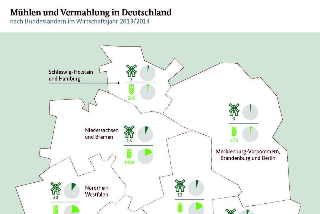 Obwohl sich die Zahl der Mühlen in Deutschland im Wirtschaftsjahr 2013/14 im Vergleich zum Vorjahr um fünf Mühlen auf 213 verringert hat, ist die Vermahlung um 1,7 Prozent auf neun Millionen Tonnen Getreide gestiegen. Entsprechend erhöhte sich die durchschnittliche Vermahlung pro Betrieb um nahezu zehn Prozent auf 42.521 Tonnen.