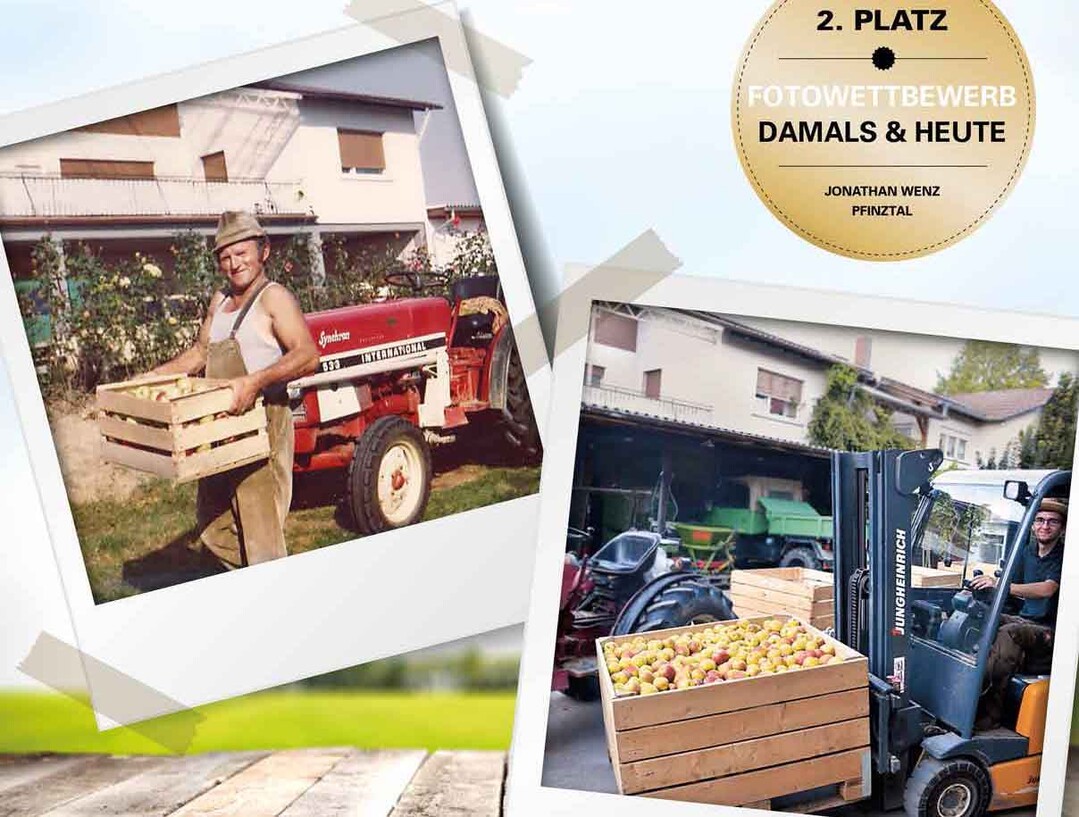 2. Platz: Jonathan Wenz, Pfinztal, Landkreis Karlsruhe. Bild damals: Obsthof Wenz, ungefähr 1980 – Friedrich Wenz bei der Ernte mit einer 20 Kilogramm Kiste und Schlepper mit Pritsche. Bild heute: 2015 Jonathan Wenz bei der Ernte mit 300 Kilogramm Großkiste, Pflückzug und Stapler.