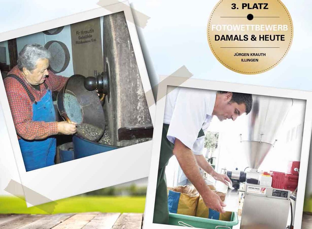 3. Platz: Jürgen Krauth, Illingen, Enzkreis. Bild damals: Ölmühle Illingen, 1998 – Ölmüller Ulrich Krauth schüttet Rapssaat in den Kollergang. Bild heute: 2014 – Ölmüller Jürgen Krauth bei der Leinöl-Herstellung an der Schneckenpresse.
