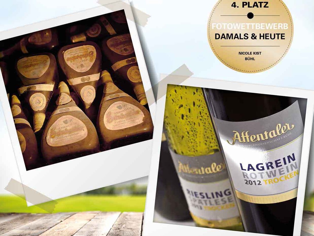 4. Platz: Nicole Kist, Bühl, Landkreis Rastatt. Bild damals: Bühl Eisental – Buddle Flasche von 1979. Bild heute: 2015 – Aufmachung Weinflasche aus der Serie „Das besondere Fass“.
