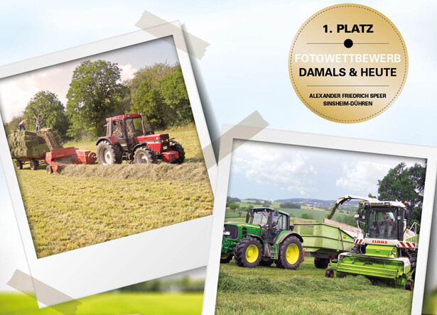 1. Platz: Alexander Friedrich Speer, Sinsheim-Dühren, Rhein-Neckar-Kreis. Bild damals: Ernte von Gras als Heu durch Handarbeit mit technischer Unterstützung. Bild heute: 2014 – Heute wird das Gras schlagkräftig mit dem Feldhäcksler für Silage geerntet.