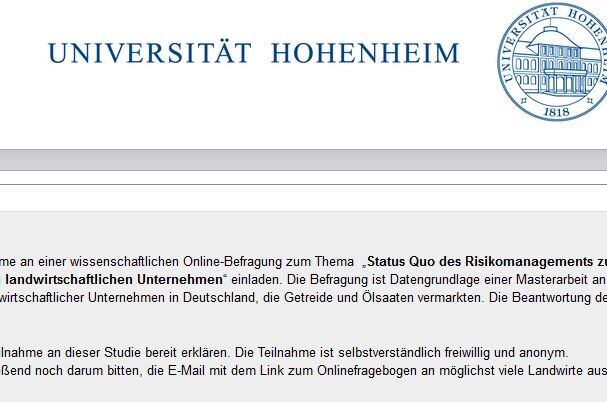 Den Fragebogen können Sie bis zum 31. Oktober 2015 ausfüllen. Mit Ihrer Mithilfe wird ein aktueller Stand des Risikomanagements von Preisrisiken im Getreide- und Ölsaatenbereich erarbeitet, der Ihnen bei Bedarf zugesendet werden kann. Die Teilnahme ist selbstverständlich freiwillig und anonym.