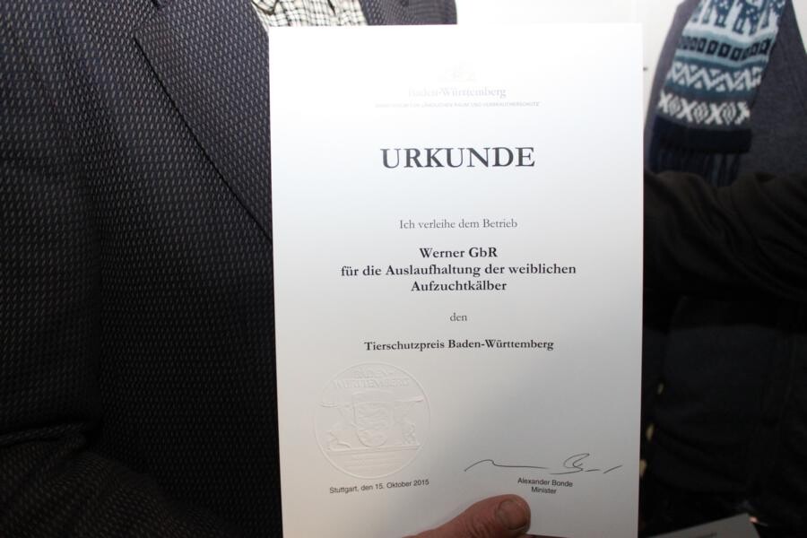 Die Landwirte Albert und Peter Werner haben heute, 15. Oktober 2015, den Tierschutzpreis für besonders tiergerechte Haltung von landwirtschaftlichen Nutztieren in Stuttgart entgegengenommen. Der Landesbauernverband (LBV) gratuliert den Betriebsleitern und deren Familie aus Römerstein-Strohweiler (Kreis Reutlingen) und sieht die wiederholte Ehrung eines landwirtschaftlichen Betriebes als Anerkennung für die positive Entwicklung der modernen Nutztierhaltung im Land.