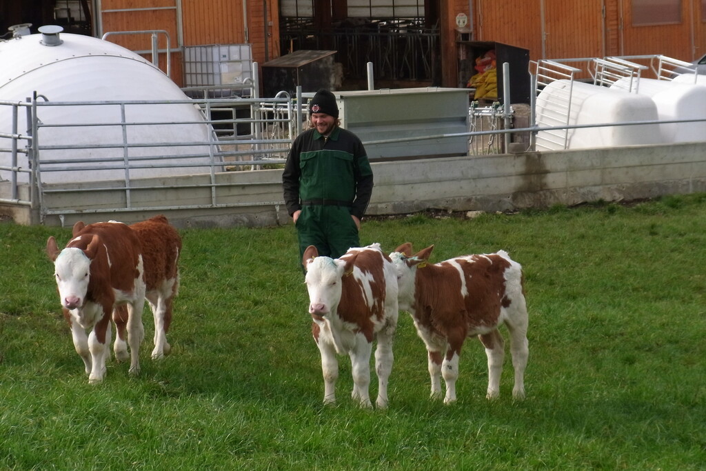 „Das ist der Vorführeffekt“, sagt und lacht Peter Werner, als er die 13 Kälber an diesem sonnig-kalten Oktobervormittag aus ihrem Gruppeniglu herauslässt, und die jungen Rinder, nicht, wie eigentlich fürs Foto geplant, fröhlich bockend über ihre Weide galoppieren. Der Grund für das gemächliche Herumtrotten ist freilich schnell ausgemacht. Der Kuhnachwuchs von Werners war heute schon einmal, gleich früh morgens,draußen. „Die haben sich schon ausgetobt“, sagt der 32-jährige Diplom-Agraringenieur (FH), dem anzusehen ist, wie sehr es ihm Freude macht, die weiblichen Kälber, die allesamt in die 100 Kühe zählende Fleckviehherde wechseln werden, so zu sehen.