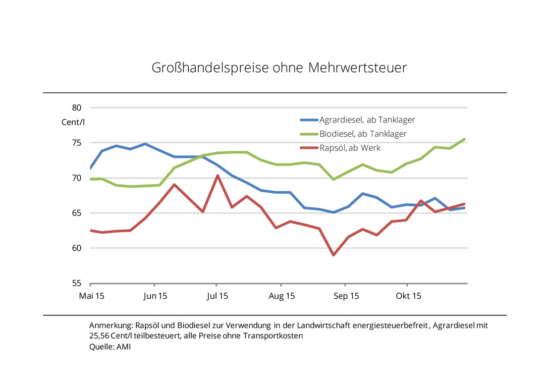 Ende Oktober 2015 kostete Biodiesel im Großhandel rund 75,60 Cent/l, exklusive Energiesteuer, und damit fast 10 Cent/l mehr als Agrardiesel. Das entspricht nach Angaben der Agrarmarkt Informations-Gesellschaft GmbH (AMI) außerdem dem höchsten Niveau seit Juni 2014. Steigende Rohstoffkosten, verbunden mit einer durch die anstehende kalte Witterungsperiode belebte Nachfrage nach Rapsölmethylester sowie hohe Frachtkosten aufgrund der niedrigen Pegelstände wichtiger Wasserwege hatten den Biodieselpreisen kräftigen Auftrieb gegeben. Gleichzeitig stehen die Preise für Agrardiesel vor dem Hintergrund schwacher Terminmarktnotierungen für Rohöl unter Druck und erreichten Ende Oktober mit durchschnittlich 65,70 Cent/l ein 2-Monatstief. Die Rapsölpreise tendierten in den vergangenen Wochen im Zuge wachsenden Käuferinteresses und immer überschaubarer werdenden Angebots fest. Zuletzt lagen sie mit rund 66,30 Cent/l für Lieferungen fob Hamburg nahezu gleichauf mit denen für Agrardiesel.