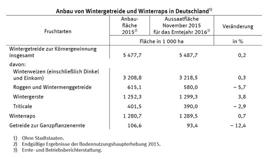 Die hochgerechneten Aussaatflächen beruhen auf Mitteilungen einer begrenzten Anzahl Ernteberichterstatter in den Bundesländern von Ende November 2015. Daher sind diese Ergebnisse als vorläufige Anbautendenzen zu bewerten, die sich bis zur Ernte 2016 noch durch Auswinterungsschäden, Schädlings- und Krankheitsbefall ändern können.