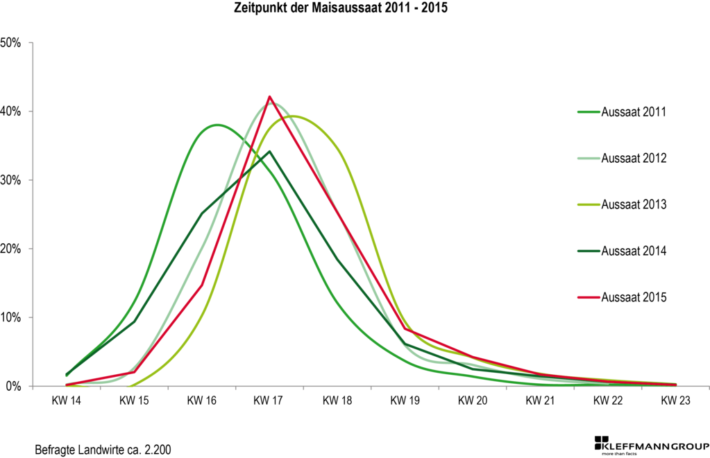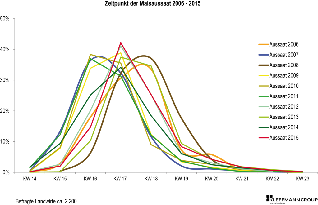 Die Kleffmann Group erfasst jährlich mit ca. 2200 Interviews aktuelle Daten zum Saatgut- und Pflanzenschutzmitteleinsatz im deutschen Mais. Ein Langzeitvergleich der Aussaatwoche über 10 Jahre zeigt, dass die Maisaussaat überwiegend zwischen Mitte April und Mitte Mai erfolgt, aber entsprechend der Aussaatbedingungen des jeweiligen Jahres früher oder später durchgeführt wird. In den Jahren 2007, 2010 und 2011 konnte die Aussaat aufgrund guter Bedingungen früher erfolgen als im Durchschnitt. Der Großteil des Saatgutes wurde Mitte April in den Boden gebracht. Dagegen war die Aussaat in den Jahren 2006 und 2008 mit Mitte Mai deutlich später. Die restlichen Jahre herrschten Anfang Mai ideale Bedingungen für die Aussaat, sodass der Großteil des Maissaatgutes zu dieser Zeit gesät wurde. Dabei ist auffallend, dass die Aussaat von 2012 bis 2015 im mittleren Zeitfenster, also Anfang Mai, erfolgen konnte.