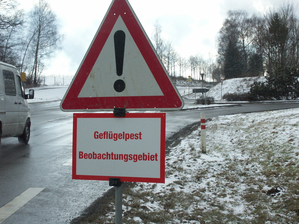 - In diesen Kreisen gelten zusätzlich besondere Biosicherheitsmaßnahmen, wie zum Beispiel das Tragen von Schutzkleidung in den Ställen, kein Zugang betriebsfremder Personen, sorgfältige Einhaltung von Desinfektionsmaßnahmen, intensives Beobachten des Gesundheitszustandes der Tiere auch in Kleinstbeständen und bei Auffälligkeiten sofortige Zuziehung des Haustierarztes.