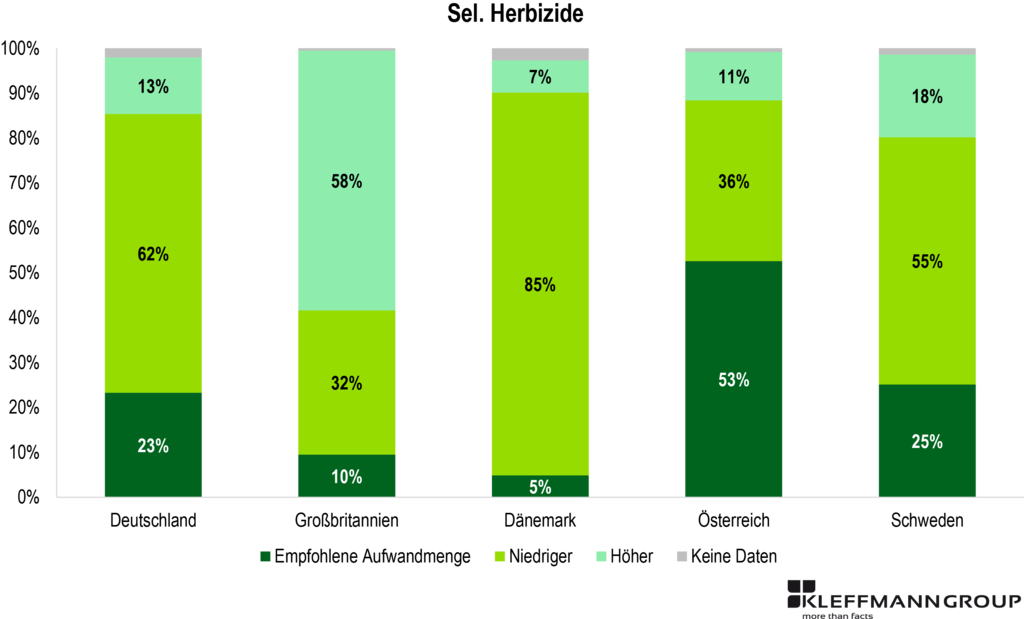 Ein gegenteiliges Bild ergibt sich in Großbritannien. Hier ist deutlich zu erkennen, dass die Landwirte in allen Produktgruppen eine höhere Aufwandmenge, als die empfohlene nutzen. Bei den Fungiziden ist dies bei 36 Prozent der Nennungen der Fall, bei den selektiven Herbiziden sind es schon 58 Prozent und bei den Insektiziden wurde in 80 Prozent der Produktnennungen eine höhere Aufwandmenge genannt. Nach dem Motto „viel hilft viel“ versuchen die Landwirte sich so an die meist etwas feuchtere Witterung anzupassen.