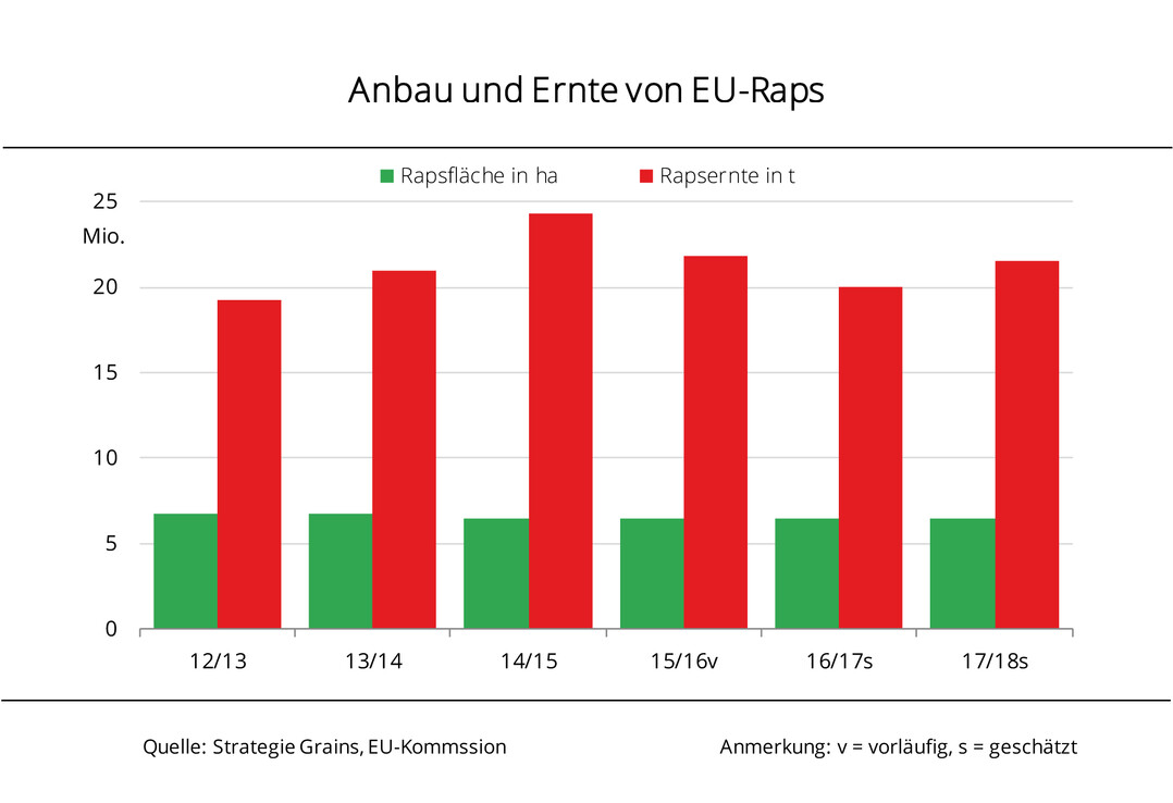Nach Angaben der Agrarmarkt Informationsgesellschaft mbH (AMI) werden darüber hinaus keine größeren Ausfälle in der EU-28 erwartet, sodass die Ernteschätzung deutlich über dem Vorjahresergebnis bleibt. In Frankreich wird die Umbruchrate nach dem Winter nicht größer sein als üblich. Aber die Reduzierung der Anbaufläche um rund 7 % gegenüber 2016 wird das Erntepotenzial deutlich limitieren. Die deutsche Rapsernte wird auf 5,1 Mio. t taxiert und damit 0,5 Mio. t größer sein als im Vorjahr. Im Vereinigten Königreich soll die Größe der Winterrapsfläche auf ein 13-Jahrestief gefallen sein. Erste Prognosen rechnen mit einer Anbaufläche 2017/18 von 0,52 Mio. ha und einer Rapsernte von 1,8 Mio. t.