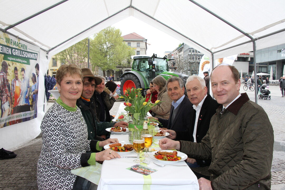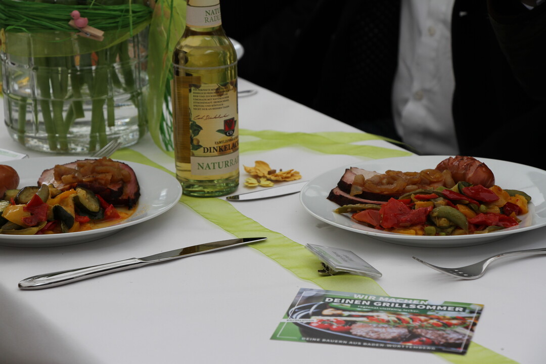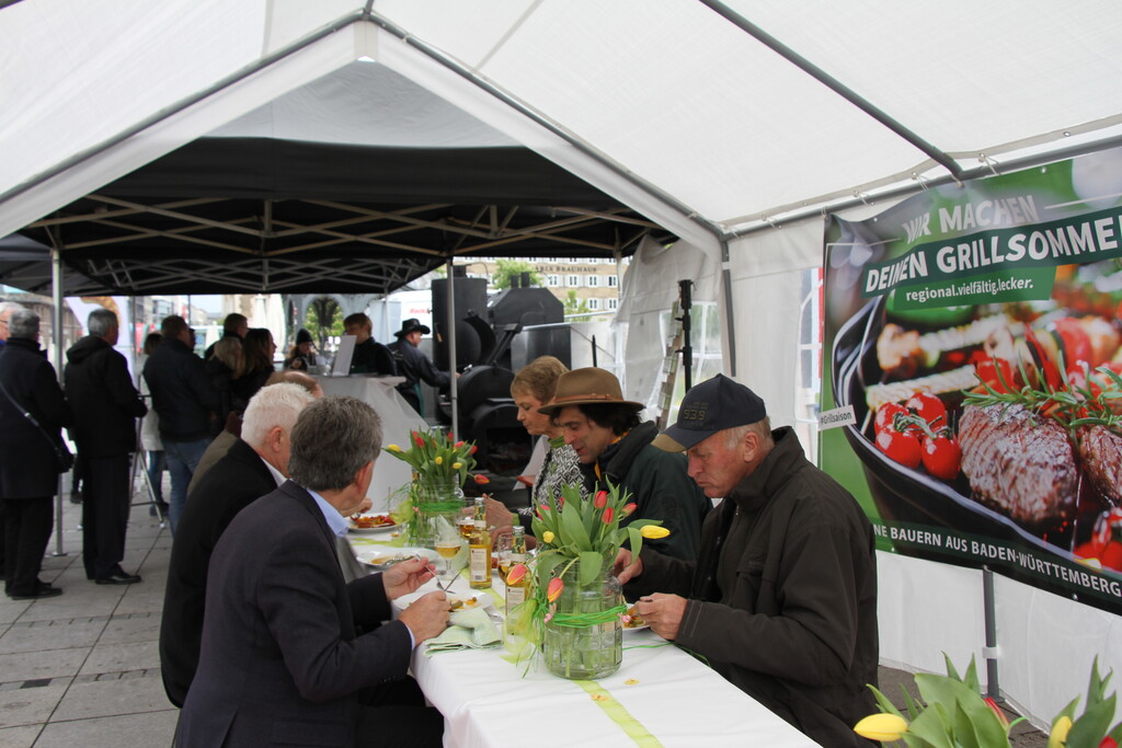 Grillgeruch steigt den Bürgern auf dem Stuttgarter Schlossplatz in die Nasen. Der Landesbauernverband, Stuttgarter Bauern und der Landesinnungsverband des Fleischerhandwerkes eröffneten dort am Mittwoch die Grillsaison. „Grillen ist eine weltweit beliebte, soziale Freizeitbeschäftigung. Wir Landwirte erzeugen die Grundlagen jedes Grillfestes. Ob Käse, Gemüse oder Fleisch – Bürger können die vielfältigen Grillzutaten aus der Region genießen“, erklärt LBV-Vizepräsident Hans-Benno Wichert. Frühzeitig hat Grillweltmeister Heinz Schaal aus Tübingen am Morgen seinen eindrucksvollen Smoker-Grill angeheizt, damit die Leckereien pünktlich zur Mittagszeit servierfertig sind. Mit ihm sind Bauern aus Stuttgart mit Traktor zur langen, gedeckten Tafel in die Innenstadt gekommen, um für die bunte Grillpalette bei den Bürgern zu werben. Denn der Grillsommer soll zu einem Genusssommer werden.