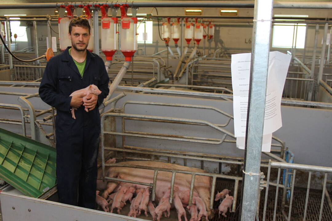 „Die Ferkelverluste waren wegen der neuen Bewegungsbuchten um im Schnitt ein Jungtier pro Wurf höher als zuvor", sagt der studierte Landwirt, „da mussten wir handeln“. Seither sperren sie die Zuchtsauen direkt nach der Geburt in den verschließbaren Ferkelkorb der Bewegungsbuchten ein. Mit Erfolg, wie Vater und Sohn versichern. Die neu geborenen Ferkel laufen seit diesem Zeitpunkt nicht mehr Gefahr, von ihrer Mutter erdrückt zu werden.