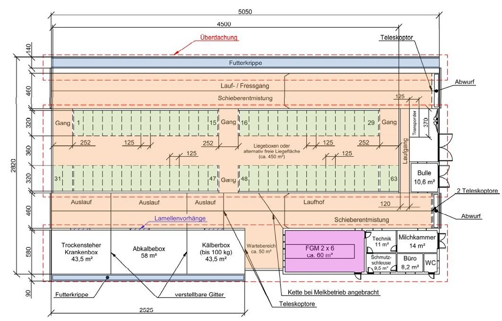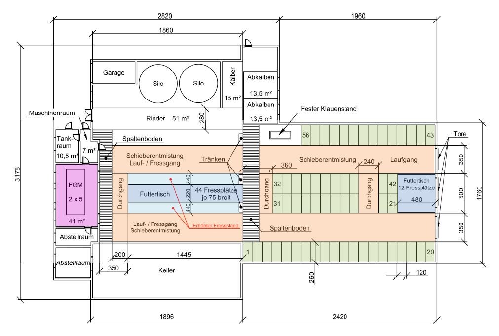 Gleiches gilt für die Kontaktmöglichkeit vom Warteraum zu der benachbarten Kälberbucht. Der Betriebsleiter würde aus heutiger Sicht den Melkstand quer anordnen, die Kompostfläche 5,0 Meter (m) breiter sowie zwei Futterachsen für die Kühe anlegen. So käme er zu einer bequemer befahrbaren Liegefläche (zum Auflockern/Belüften), die größer wäre und mehr Tiere möglich machen würde. Zwei vollwertige Futterachsen würden allen Kühe einen Fressplatz bieten.