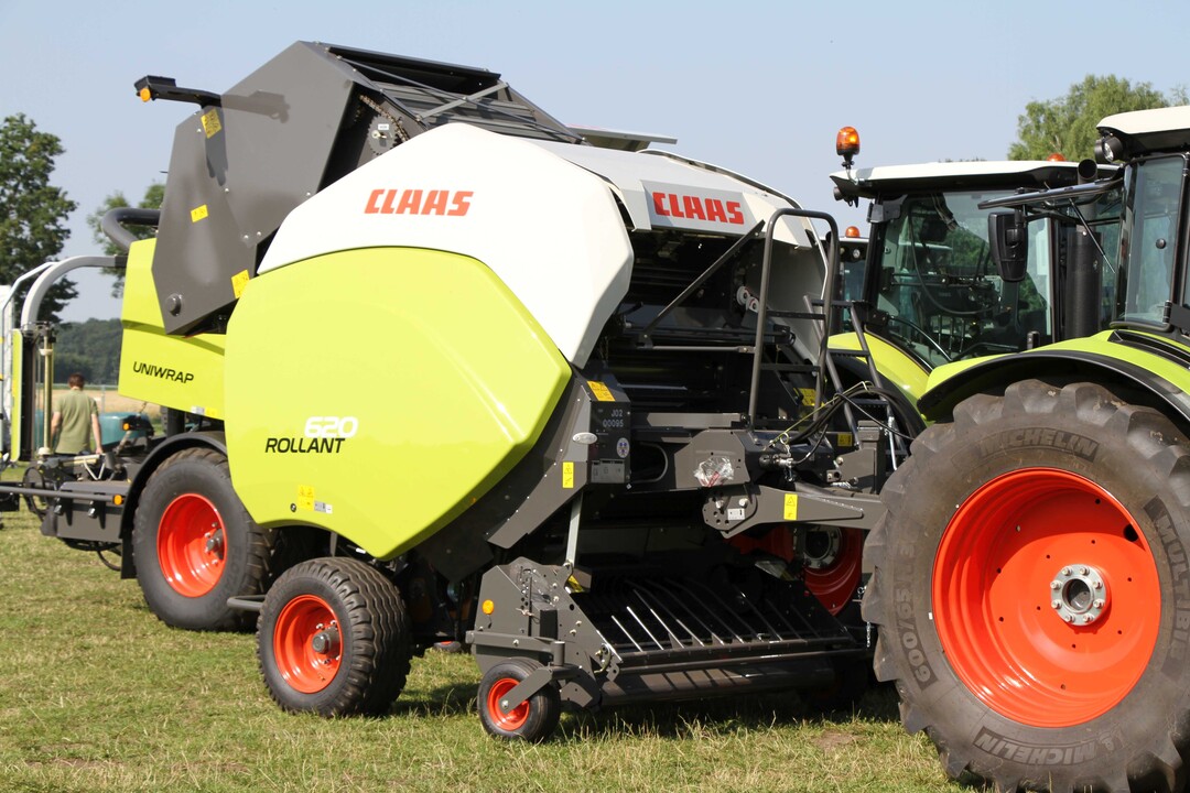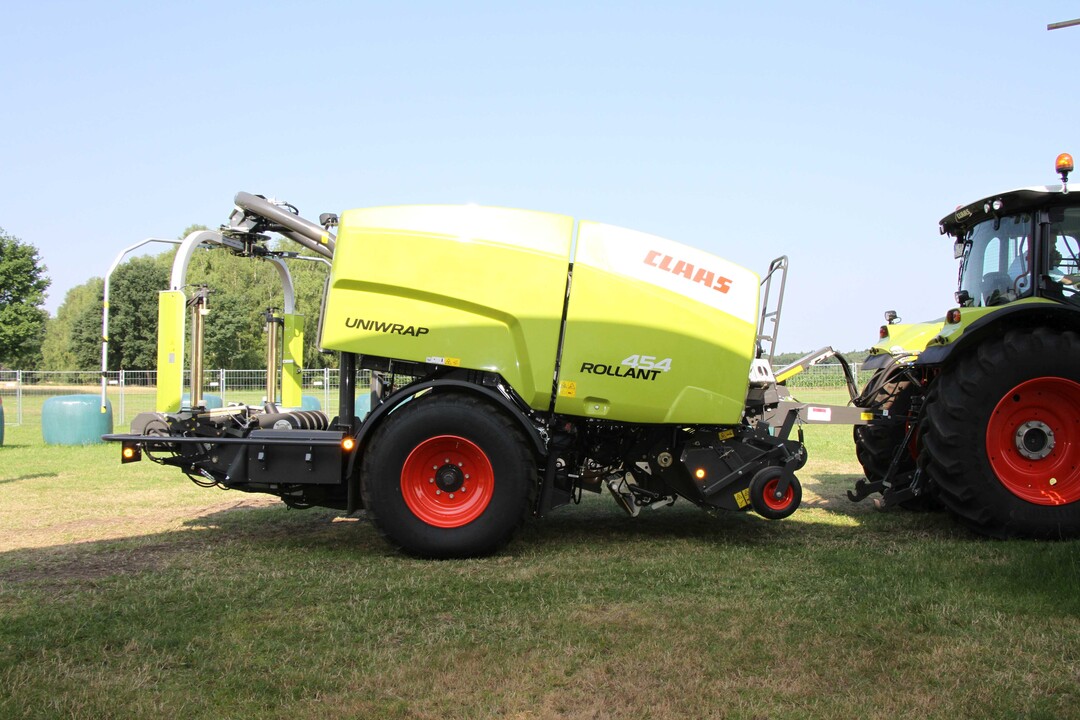 Claas bietet für die Rundballenpressen der Rollant 400 Uniwrap Familie ein neu entwickeltes System für die Bindung der Ballen in der Presskammer an. Statt der üblichen Netzbindung können die Rundballen auch mit Mantelfolie gebunden werden. Die Netzbindung ist nach wie vor möglich, genauso wie der schnelle Wechsel zwischen Netz und Mantelfolie ohne Umbaumaßnahmen. Bei der Mantelfolienbindung gibt es im Arbeitsverlauf bis auf das Bindematerial keine Unterschiede zur gängigen Netzbindung. Hat ein Ballen in der Presskammer die gewünschte Größe erreicht, wird er automatisch mit bis zu acht Folienlagen gebunden. Anders als beim Netz ragen die Folienlagen einige Zentimeter über die seitlichen Ballenränder hinaus. Beim anschließenden Wickeln des Ballens auf dem Wickeltisch müssen deshalb nicht wie üblich sechs Wicklungen vorgenommen werden, sondern es können Folienlagen eingespart werden. Der Anwender kann zwischen Netz- und Folienbindung wechseln. Dafür muss der Fahrer lediglich die Voreinstellung im Kabinenterminal ändern und das gewünschte Bindematerial in der Presse einlegen. Um das Beladen der Pressen mit einer neuen Folien- oder Netzrolle zu vereinfachen, verfügen die die Pressen serienmäßig über eine seitlich angebrachte, klappbare Rollenrampe. Damit lassen sich die bis zu 50 kg schweren Rollen leichter in die Maschinen einlegen. Die Rollant 400 Uniwrap produziert Rundballen mit Durchmessern von 1,25 bis 1,35 m bei einer Ballenbreite von 1,20 m.