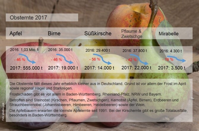 In Deutschland erwarten die Apfelanbauer frostbedingt die kleinste Apfelernte seit 1991. Ausgegangen wird von einer Ernte von nur rund 555.000 Tonnen nach 1,03 Millionen Tonnen 2016. Insbesondere in Baden-Württemberg werden deutlich weniger Äpfel geerntet, im Norden sieht es besser aus. Wirtschaftlich besonders hart getroffen sind die Betriebe mit Totalverlusten oder sehr kleinen Ernten. Auch in der EU insgesamt wird eine deutlich geringere Apfelernte erwartet. Die Ernteschätzung liegen hier bei 9.3 Millionen Tonnen und damit 21 Prozent niedriger als im Vorjahr. Die deutsche Birnenernte wird bei 19.000 Tonnen liegen, 46 Prozent weniger als 2016 (35.000 Tonnen).