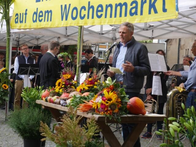Der Verkauf regionaler Produkte auf Wochenmärkten ist nicht altmodisch. Auch wenn manche Börsenakteure das meinen würden. Das Gegenteil zeigen wöchentlich die Kunden, erklärte LBV-Vizepräsident Gerhard Glaser beim Erntedank-Wochenmarkt am Samstag, 30. September 2017, vor der Stiftskirche in Stuttgart.