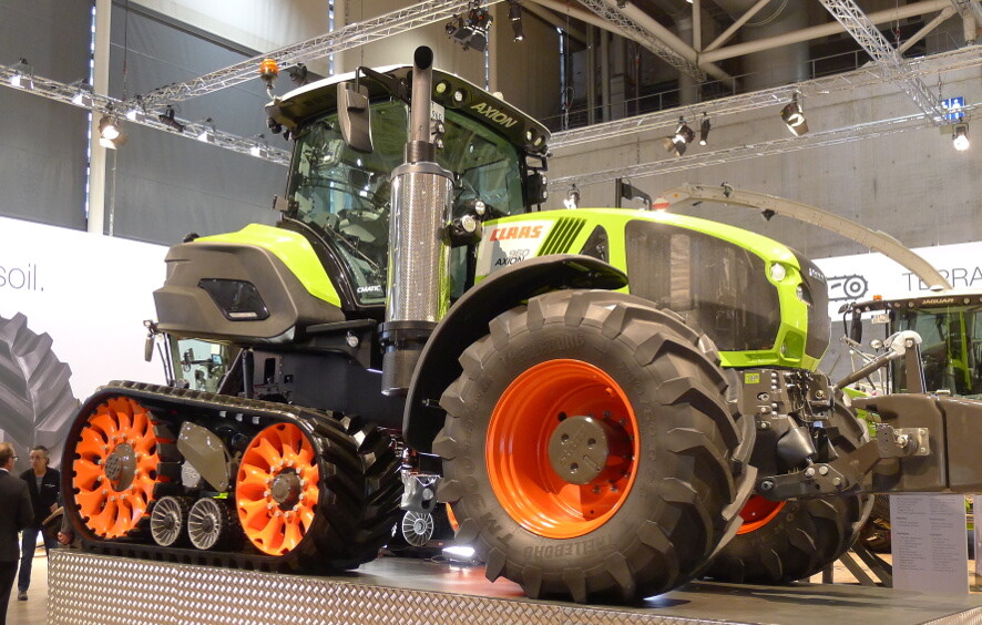 Mit dem Axion 900 Terra Trac stellt Claas den ersten voll gefederten Halbraupentraktor vor. Die DLG zeichnete das Konzept auf der Agritechnica 2017 mit einer Silbermedaille aus. Das Laufwerk basiert auf der vom Mähdrescher bekannten Technologie. Das im Vergleich zu Feldhäcksler und Mähdrescher größere Triebrad ermöglicht die Übertragung höherer Drehmomente. Auch bei schwerer Bodenbearbeitung und langsamer Fahrgeschwindigkeit bringt das Laufwerk die Antriebsleistung mit minimalem Schlupf auf den Boden. Das Terra Trac des noch im Vorserien-Status befindlichen Axion kombiniert die Vorteile eines Raupentraktors bei Traktion und Bodenschonung mit dem Fahrkomfort eines Standardtraktors. Dank der separaten Federung von Triebrad, Laufrad und Stützrollen passt sich das Laufwerk immer optimal an den Boden an. Der Axion 900 Terra Trac ist bei großer Aufstandsfläche deutlich schmaler, als eine breit- oder zwillingsbereifte Maschine. Die Federung bietet höchsten Fahrkomfort bis 40 km/h, heißt es bei Claas.