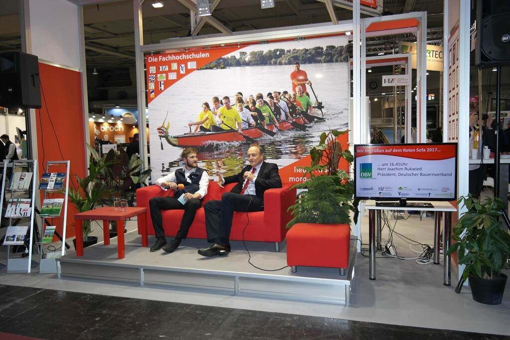 Vom 14. bis 17.11.2017 finden täglich Gespräche mit den eingeladenen Fach- und Führungskräften auf dem „Roten Sofa“ statt, in denen die Interviewpartner von Studierenden zu den Themen Werdegang, Studium, Qualifikationen und Bewerbungen befragt werden. Ziel ist neben einem fachlichen Austausch, Studieninteressierte für die grünen Berufe zu begeistern und zu den Themen Studium und Berufseinstieg zu informieren.