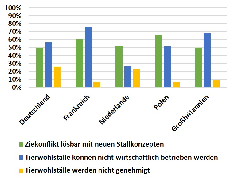 So sind zwischen 50 und 60 Prozent der in den Ländern befragten Schweinehalter der Meinung, dass sie den Zielkonflikt zwischen Tierwohl und Umweltschutz grundsätzlich mit neuen Stallkonzepten lösen können, halten jedoch mehrheitlich die Tierwohlställe nicht für wirtschaftlich.