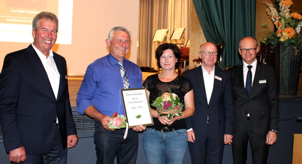 Für den Aufsichtsrat wiedergewählt wurden Hubert Brauchle, Ernst Haberkorn, Helmut Kibler und Michael Müller. Altershalber ausgeschieden aus dem Aufsichtsrat ist Paul Maucher, Bad Waldsee. Für sein langjähriges Engagement wurde er mit einer Urkunde ausgezeichnet und ihm ein Geschenk überreicht. Paul Maucher gehörte über 15 Jahre dem Aufsichtsrat an und hat in dieser Zeit Verantwortung übernommen und das Unternehmen mitgestaltet und zu dem gemacht, was es heute ist, so Widmann seiner Laudatio. Als Dankeschön überreichte er Paul Maucher eine Ehrenurkunde in Anerkennung an den 15-jährigen Verdienste und als Abschiedsgeschenk gab es einen Gutschein für das internationale Reittunier German Masters in Stuttgart.