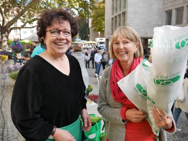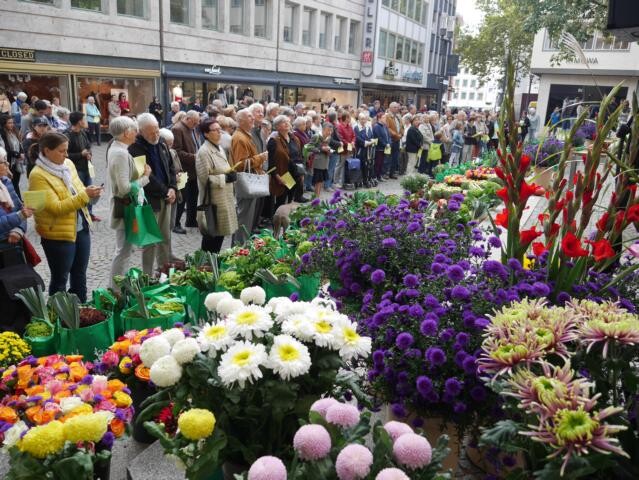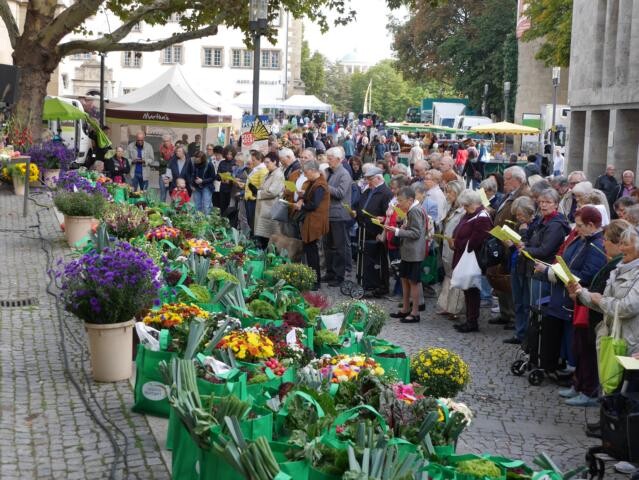 Alle genannten Redner, weitere Marktbeschicker und Mitarbeiter vom Gärtnereiverband verkauf ten unmittelbar nach dem Erntedank-Gottesdienst die prächtig gefüllten Körbe und Taschen mit den gestifteten Erntegaben der Marktbeschicker zu Gunsten von „Brot für die Welt'' und „Misereor". Dabei belief sich der Preis auf 10,- Euro je Tasche und 8,- Euro je Korb.
