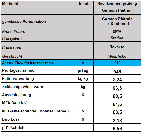 Mit rund 70 Tagen werden aus den Würfen geeignete weibliche Tiere für die Prüfstation Boxberg ausgewählt. Alle drei Wochen gehen 48 Prüftiere an die LSZ Boxberg und werden dort unter standardisierten Bedingungen geprüft. Die restlichen Prüfferkel werden auf zwei, dem Ferkelhof Pfahlbach angeschlossenen, Mastbetrieben gemästet. Dadurch erweitert sich das Prüfprogramm um rund. 800 Tiere auf der Station und 13.000 Tieren in der Feldprüfung. Seit Juni dieses Jahres werden kontinuierlich Prüftiere an der LSZ geschlachtet und ausgewertet. Neben den Exaktdaten für die Merkmale der Fleischqualität liefert die Stationsprüfung Daten aus der Teilstückzerlegung, bei der der wahre Fleischanteil ermittelt wird. Ein Fokus liegt zudem auf der Futterverwertung, die durch Exaktfutterabrufstationen an der LSZ ermittelt wird.