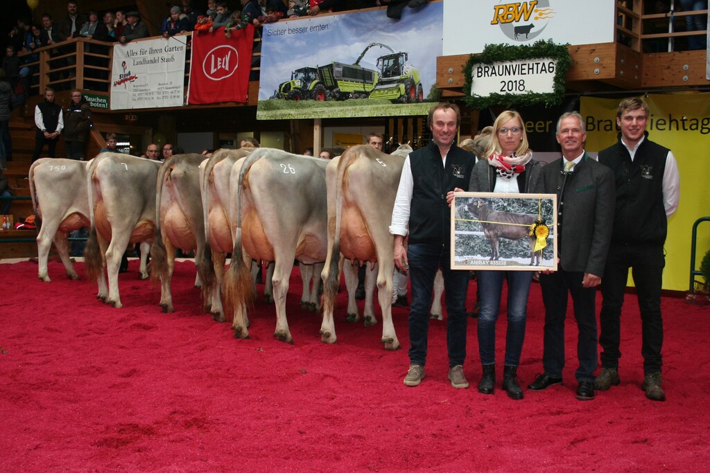 Neben dem hohen Niveau der Schaukühe wurde mit einer Töchtergruppe von Anibay eine interessante Nachzuchtgruppe. Die acht ausgestellten Töchter bestätigten den Bullen als Exterieurvererber mit viel Milch. Anibay-Töchter sind groß, stilvoll und zeigen dennoch genug Breite. Glanzpunkte der Vererbung sind vor allem die korrekt gestellten, feinen Beine sowie die hochangesetzten und breiten Euter. Die Striche sind ideal gestellt und zeigen eine gute Form.