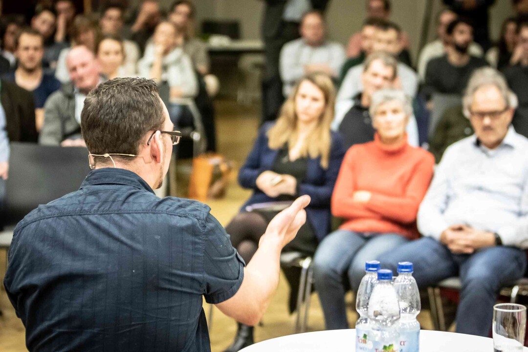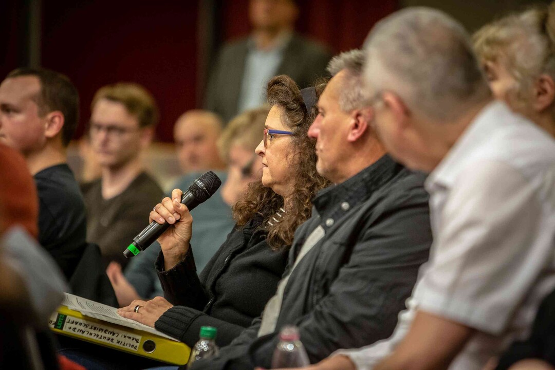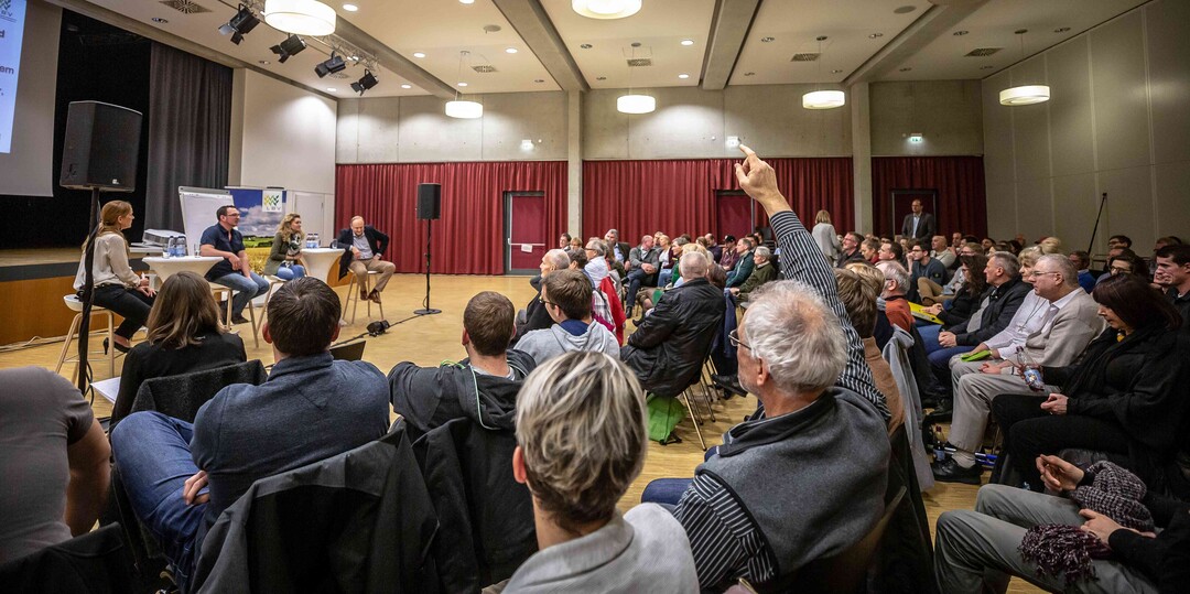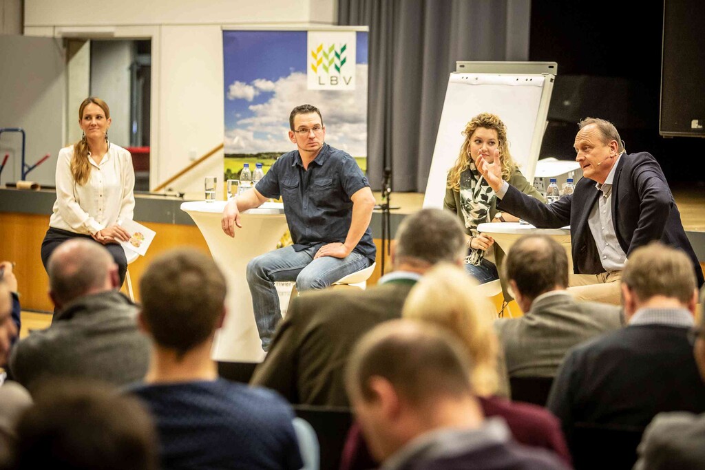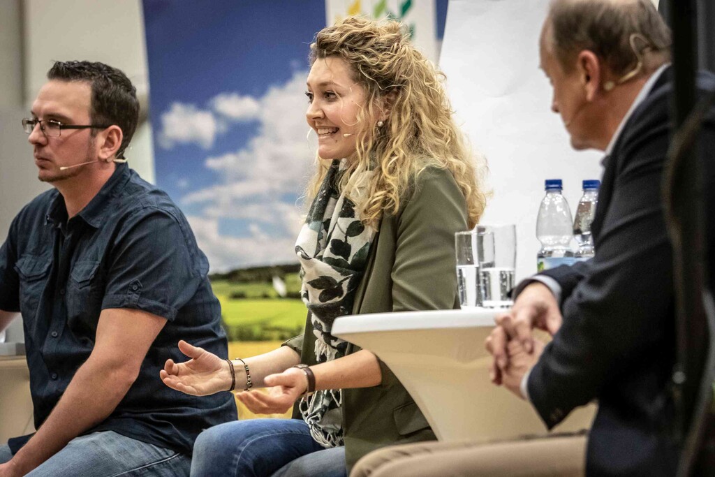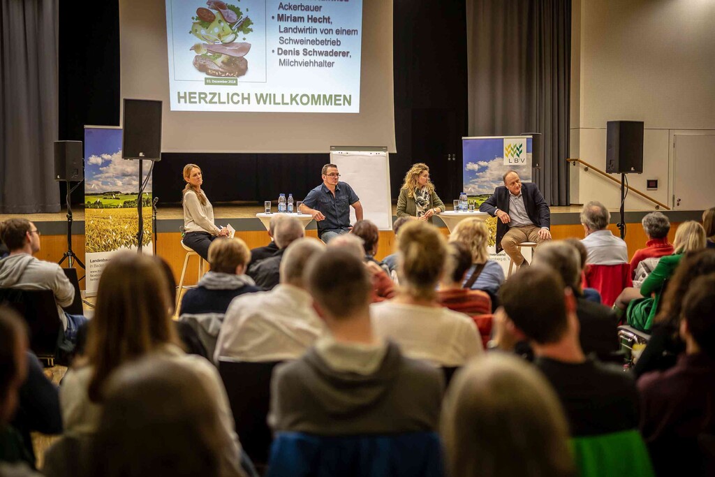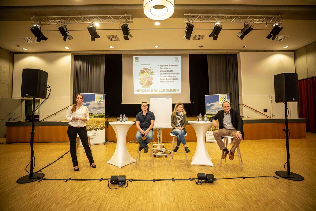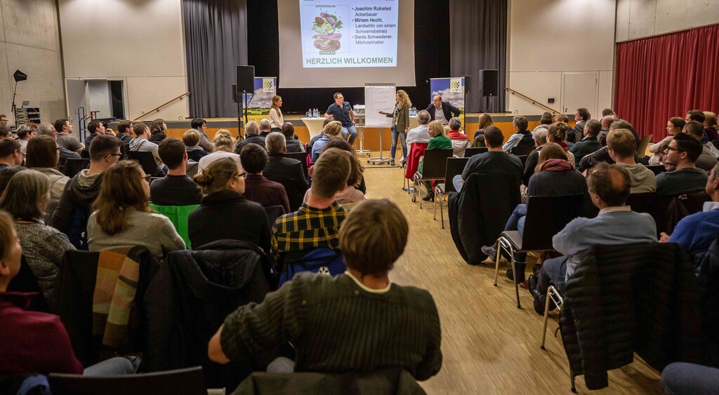 Beim ersten Bürgerdialog am Montag stellten sich Miriam Hecht (Schweinehalterin aus Sulmingen, Kreis Biberach), Denis Schwaderer (Milchviehhalter im Stiftsgrundhof, Rems-Murr-Kreis) und DBV- sowie LBV-Präsident Joachim Rukwied den Fragen der rund 150 anwesenden Verbraucher. Alle drei sind leidenschaftliche Landwirte, die auf ihren Betrieben die Öffentlichkeitsarbeit fest integriert haben.