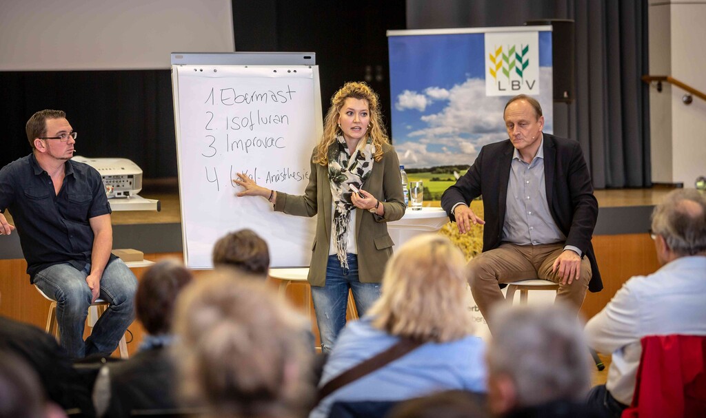 Natürlich merkt man auch in dieser Veranstaltung, dass das Tierwohl einen hohen Stellenwert hat. So bleibt auch die Frage nicht aus, warum es denn nötig sei, die Übergangszeit beim Thema Ferkelkastration um zwei Jahre zu verlängern. Man hätte doch schon fünf Jahre Zeit gehabt, sich als Landwirt umzustellen. Miriam Hecht, die von einem Hof mit Sauenhaltung kommt, erklärte ausführlich die Möglichkeiten bei der umstrittenen Ferkelkastration. Und das auch mit dem nötigen 'Einfühlungsvermögen'. So erklärt sie, dass sie die Kastration beim Ferkel in nur 7 Sekunden durchführt - bei dieser Aussage zucke selbst ihr Freund zusammen. Betroffene Gesichter bei den männlichen Besucher, ein Lächeln bei den anwesenden Damen. Bauernverbandspräsident Joachim Rukwied betonte wiederholt, dass der geregelte Ausstieg aus der betäubungslosen Kastration ausdrücklich gewünscht sei, notwendig seien aber auch praxistaugliche Lösungen für alle Betriebe.