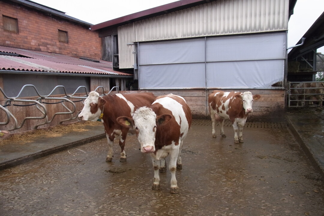 Konkret: Ein Teil der Kühe frisst im Stall auf erhöhten Fressplätzen, der andere Teil hält sich draußen im Laufhof auf, frisst an den dortigen, überdachten und begrünten Fressplätzen oder liegt in den nicht überdachten Liegebuchten. Auf den Laufgängen im Innern des Stalls befördert derweil ein Schieber fortlaufend den Mist nach draußen.