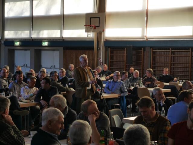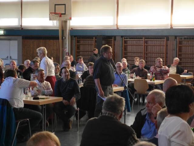 Den Gemeinden billigt er zu, „das auf ihren Flächen selbst zu realisieren, was sie von anderen einfordern“, kommt er auf kommunale Auflagen in Pachtverträgen zu sprechen. Aber das solle bei Neuverpachtungen und nicht bei laufenden Verträgen geschehen. Solche Äußerungen gefallen nicht jedem in der Turn- und Festhalle Schwieberdingen. So wird die Diskussion sehr lebhaft und teils emotional.