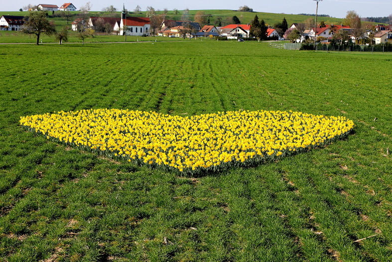 Für seinen Heiratsantrag hat sich der Landwirt und Schafhalter Johannes Kieble etwas ganz Besonderes einfallen lassen. Er hat sich im Oktober 2018 insgesamt 2500 Steckzwiebeln besorgt und sie einzeln auf 80 Quadratmeter in Herzform liebevoll in den Boden gesetzt. Ein echtes Kunstwerk. Das Ergebnis lässt sich jetzt über Ostern bewundern.