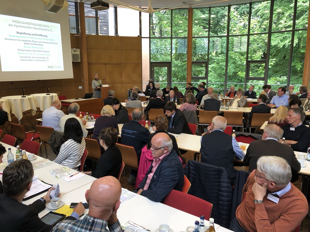 Dr. Juliane Rumpf, Vorsitzende des Vorstands der Agrarsozialen Gesellschaft e.V., betonte in ihrer Begrüßung die Notwendigkeit, sich auf allen politischen Ebenen auf die aktuellen Herausforderungen und Chancen von Demografie und Digitalisierung einzustellen. Gemeinderäte müssten die Weichen für den Bau von kleinen, bezahlbaren Wohnungen stellen, Kreistage für einen flexibleren und bedarfsgerechten ÖPNV. Angesichts der von der EU-Kommission angedrohten Absenkung der Fördermittel für den ländlichen Raum richteten sich die Hoffnungen auf die Ergebnisse der Arbeit der Kommission für gleichwertige Lebensverhältnisse auf Bundesebene.
