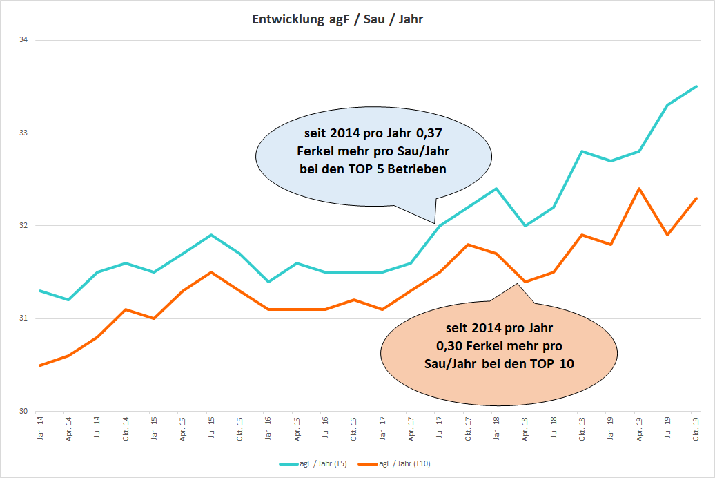 Die neuesten Betriebsauswertungen sprechen, so das Unternehmen, dabei eine eindeutige Sprache: So stieg die Anzahl der lebend geborenenFerkel pro Sau und Jahr seit 2014 um 0,43 Ferkel pro Sau und Jahr (Top 5) beziehungsweise um 0,48 Ferkel pro Sau und Jahr (Top 10).Gleichzeitig verringerten sich dieFerkelverluste im gleichen Zeitraum um 0,23 Prozent pro Jahr (Top 5) beziehungsweise um um 0,33 Prozent pro Jahr (Top 10).