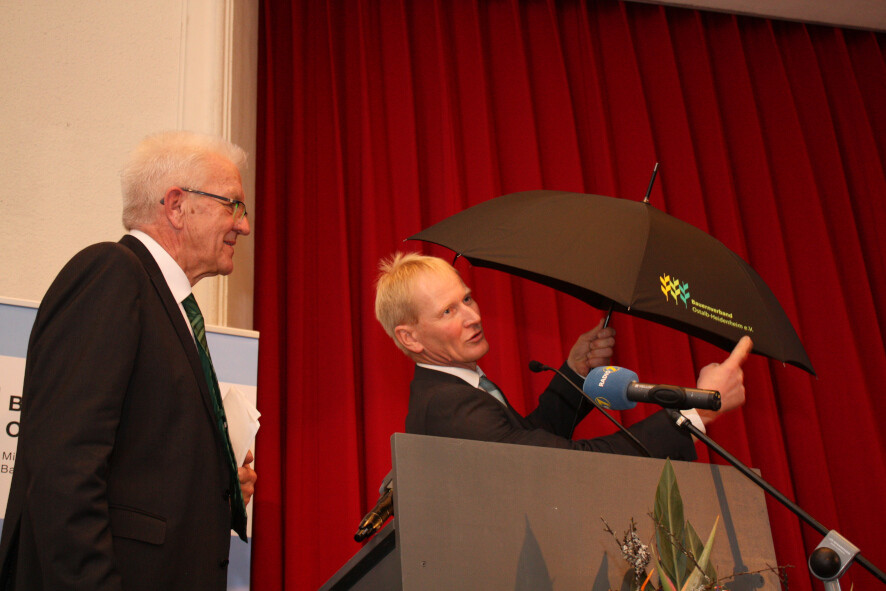 „Immer mehr und billiger und gleichzeitig immer ökologischer, das geht nicht, stellt Kretschmann fest. Denn so machen wir unsere traditionsreiche Landwirtschaft auf Dauer kaputt. In der Verantwortung sieht er auch die Großhandelsketten. Beim letzten Treffen der Ministerpräsidenten habe er die Zusage der Kanzlerin zu Gesprächen mit den Discountern über faire Preise für heimische Lebensmittel erhalten. Kretschmann versprach dem Bauernverbandschef Hubert Kucher, ein Exemplar seiner Rede mitzunehmen und dazu Stellung zu nehmen.