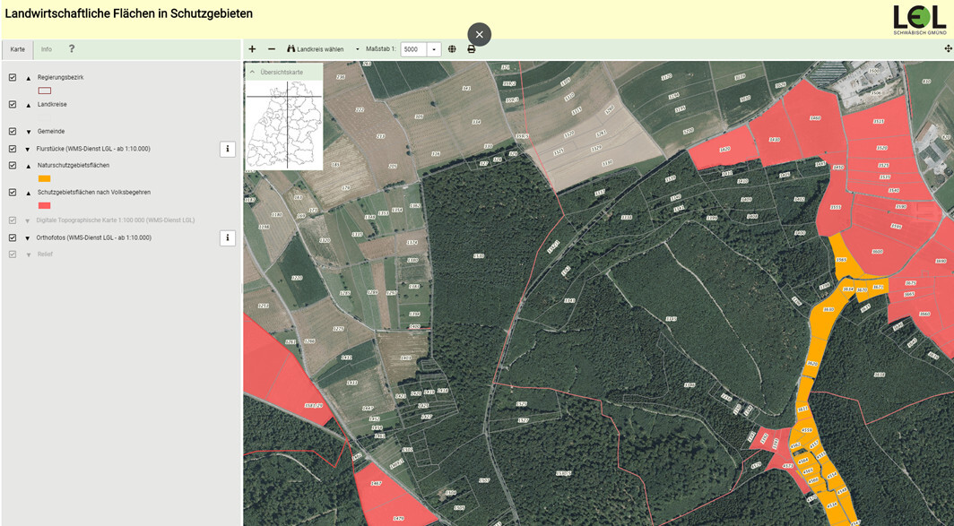 Um welche Flächen es sich beim Volksbegehren und beim Eckpunktepapier jeweils handelt, ist in der Karte „Landwirtschaftliche Flächen in Schutzgebieten“ abgebildet. Sie steht im Infodienst Landwirtschaft – Ernährung – Ländlicher Raum allen Interessierten zur Verfügung. Hier geht es zur Karte
