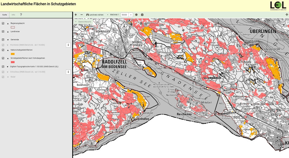 Die Karte ermöglicht die Betrachtung auf der Ebene eines Landkreises und von Gemeinden bis hin zu einzelnen Flurstücken. Sie gibt den Bewirtschaftern damit Anhaltspunkte, ob die bewirtschafteten Flächen Teil eines Schutzgebietes sind und von einem Pflanzenschutzmittelverbot nach den Forderungen des Volksbegehrens ProBiene (rot markiert) betroffen wären. Die Naturschutzgebiete sind ebenfalls aufgeführt (orange markiert) und stellen die Verbotsflächen nach den Vorgaben des Eckpunktepapieres dar.