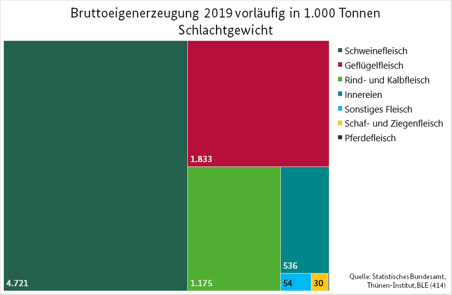 Die Bundesanstalt hat die Versorgungsbilanz für Fleisch und Fleischwaren des vergangenen Jahres aktualisiert. Vorläufigen Zahlen zufolge lag in Deutschland die Nettoerzeugung (Schlachtmenge) von Fleisch in 2019 bei etwa 8,6 Millionen (Mio.) Tonnen Schlachtgewicht (SG) und verzeichnete somit einen leichten Rückgang von 1,9 % im Vorjahresvergleich. Auch wenn die Erzeugung von Schweinefleisch nach wie vor den höchsten Anteil ausmacht, ging dessen Nettoerzeugung von etwa 5,37 Mio. Tonnen SG in 2018 auf knapp 5,2 Mio. Tonnen SG in 2019 leicht zurück. Die Erzeugung von Rind-, Kalb- und Geflügelfleisch stieg hingegen an.