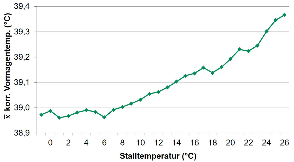 Um diese Annahme zu überprüfen, wurden an der Landesforschungsanstalt für Landwirtschaft und Fischerei in Dummerstorf eigene Untersuchungen initiiert. Dabei sollte der Verlauf der Vormagentemperatur bei Milchkühen, abhängig von der Stalltemperatur, in einem Praxisbetrieb überprüft werden. Die Vormagen-temperatur wurde mit kabellosen (telemetrischen) Messboli im 15-Minutentakt aufgezeichnet. Um die Vormagentemperatur als Indikator für die Körper-temperatur verwenden zu können, wurden Messwerte, die durch die Wasser- oder Futteraufnahme beeinflusst waren, aus den Datenreihen entfernt. Insgesamt standen 31 auswertbare Tiere bereit, die im Durchschnitt 41 Kilogramm Milch pro Tier und Tag gaben. Erfasst wurden die Daten von diesen Tieren an 135 Tagen. Gleichzeitig wurde die Stalltemperatur erfasst. Beide, Vormagen- und Stall-temperatur, wurden zu Stundenmittelwerten zusammengefasst und einander gegenübergestellt.