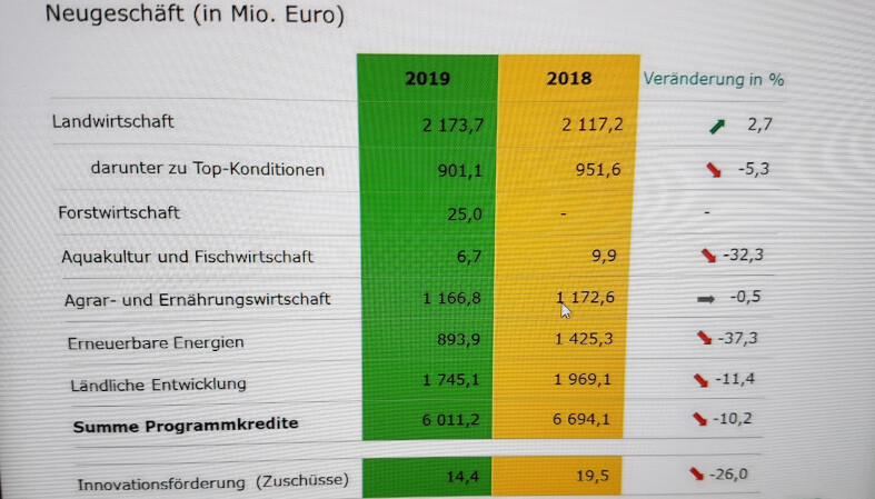 In der Fördersparte „Landwirtschaft“ stieg das Neugeschäft dagegen an. Hier finanziert die Rentenbank vor allem klassische landwirtschaftliche Investitionen wie Maschinen, Flächenkäufe, Stallbauten und Betriebsmittel. Dafür stellte die Förderbank 2,2 Mrd. Euro (2,1 Mrd. Euro) bereit. Geflügelställe zum Beispiel wurden verstärkt gebaut, dafür aber weniger Schweineställe. Die Zahl der geförderten Rinderställe blieb auf dem Niveau des Vorjahres. Mit ihrer Fördersparte „Agrar- und Ernährungswirtschaft“ richtet sich die Rentenbank an Betriebe, die der Landwirtschaft vor- oder nachgelagert sind. Hier blieb das Förderneugeschäft stabil und lag 2019 bei 1,2 Mrd. Euro.