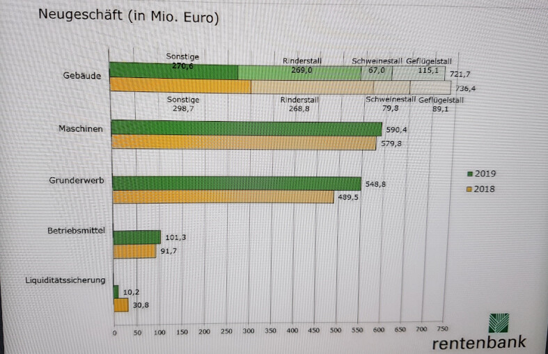 Das Förderneugeschäft mit Gebietskörperschaften, Banken und Sparkassen mit Bezug zum ländlichen Raum mittels Namenspapieren, Schuldscheindarlehen und Wertpapieren stieg auf 4,6 Mrd. Euro (3,6 Mrd. Euro). Damit lag das gesamte Förderneugeschäft der Rentenbank im Jahr 2019 bei 10,6 Mrd. Euro (2018: 10,3 Mrd. Euro).