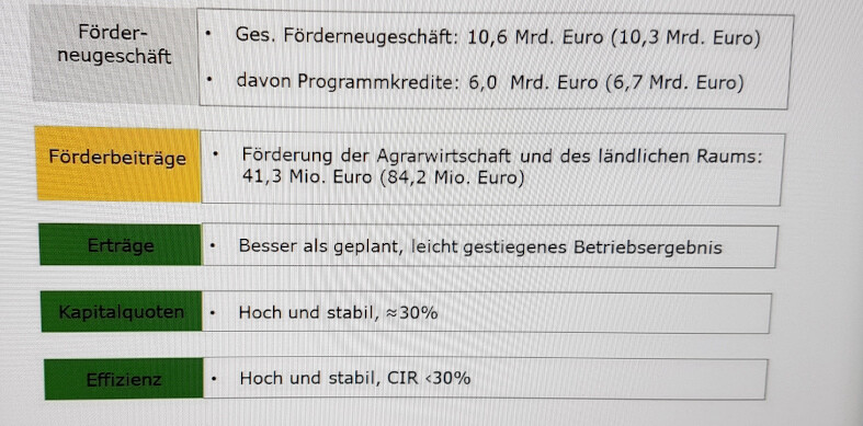 Zur Risikovorsorge erhöhte die Rentenbank die Zuführung zu den Vorsorgereserven auf 177,6 Mio. Euro (144,1, Mio. Euro). Der Jahresüberschuss reduzierte sich entsprechend von 63,0 Mio. Euro auf 32,5 Mio. Euro. Der von der Rentenbank ebenfalls vollständig für Förderzwecke eingesetzte Bilanzgewinn blieb hiervon unberührt. Er lag nach Dotierung der Hauptrücklage in Höhe von 16,2 Mio. Euro (47,2 Mio. Euro) mit 16,3 Mio. Euro wie geplant leicht über dem Vorjahreswert (15,8 Mio. Euro).