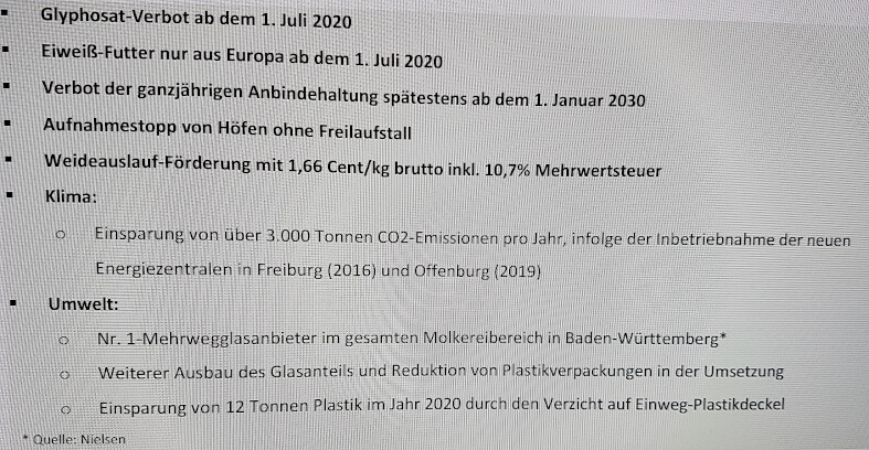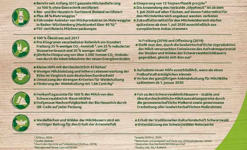 Bereits seit Jahrzehnten legt Schwarzwaldmilch aus Überzeugung großen Wert auf einen verantwortungsvollen Umgang mit Mensch, Tier und Natur. Zum Ausdruck kommt dies durch die Verantwortungsstrategie und entsprechende Maßnahmen. So wurden auf der unmittelbaren betrieblichen Ebene der Molkerei Schwarzwaldmilch nach eigenen Angaben bereits zahlreiche Verbesserungen