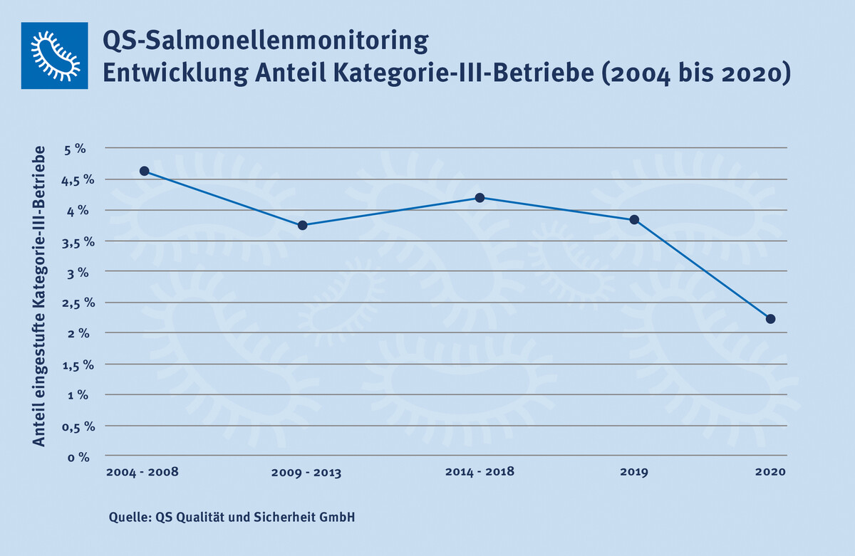 Im Jahr 2003 hat QS das Salmonellenmonitoring verpflichtend für alle Schweinehalter eingeführt, die Tiere zur Schlachtung abgeben. Die Proben werden in den Schlachtbetrieben gezogen, in QS-anerkannten Laboren auf das Vorhandensein von Salmonellenantikörpern untersucht und die Analyse-ergebnisse in der QS-Salmonellendatenbank erfasst. Vierteljährlich erhalten die Schweinemäster einen Statusbericht über alle Ergebnisse mit Auswertungen.
